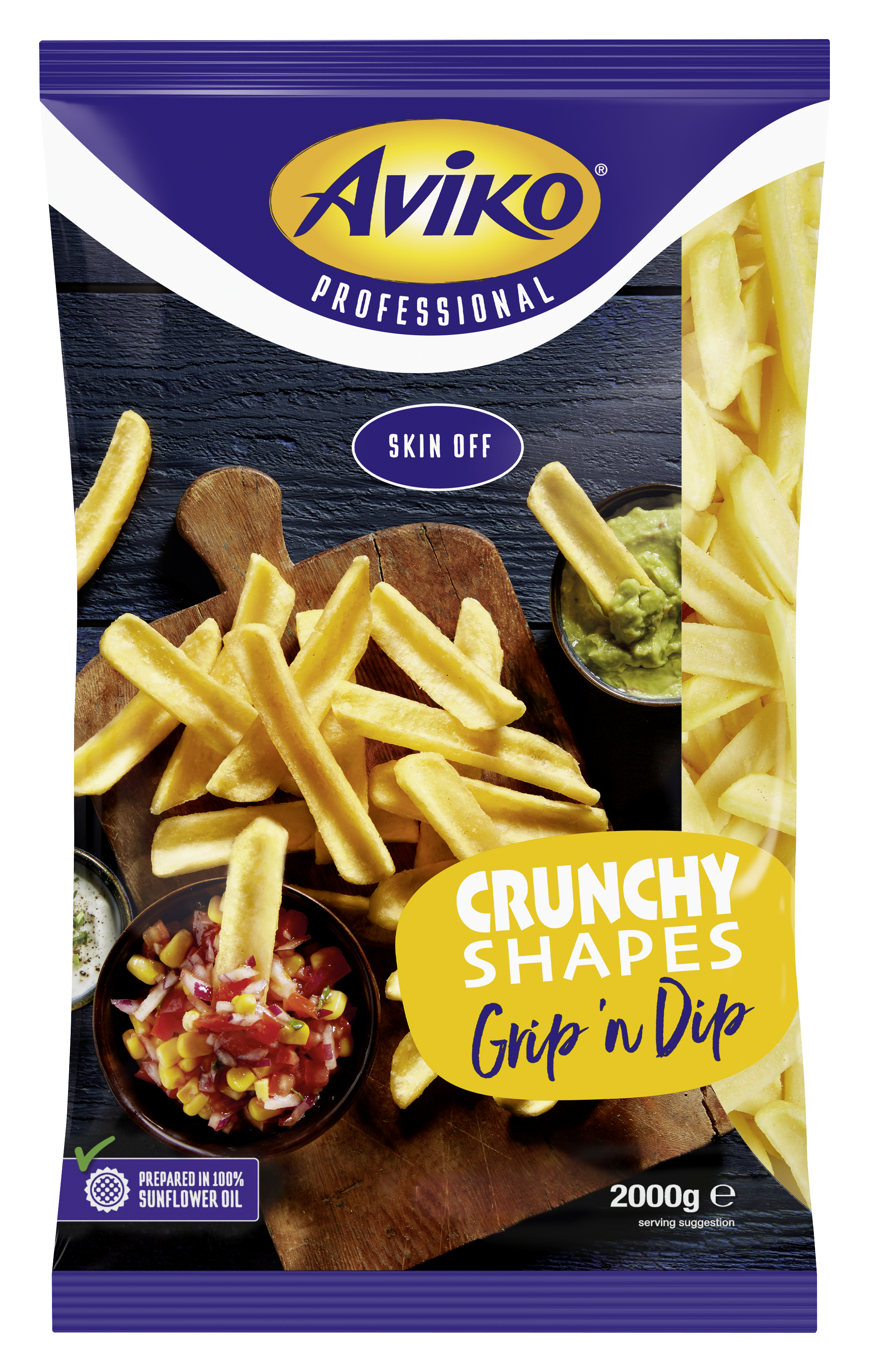Le patatine Grip 'n Dip a forma di U sono perfette per essere intinte. Il rivestimento senza glutine le mantiene calde e croccanti per un periodo di tempo più lungo, rendendole adatte alla consegna e all'asporto.