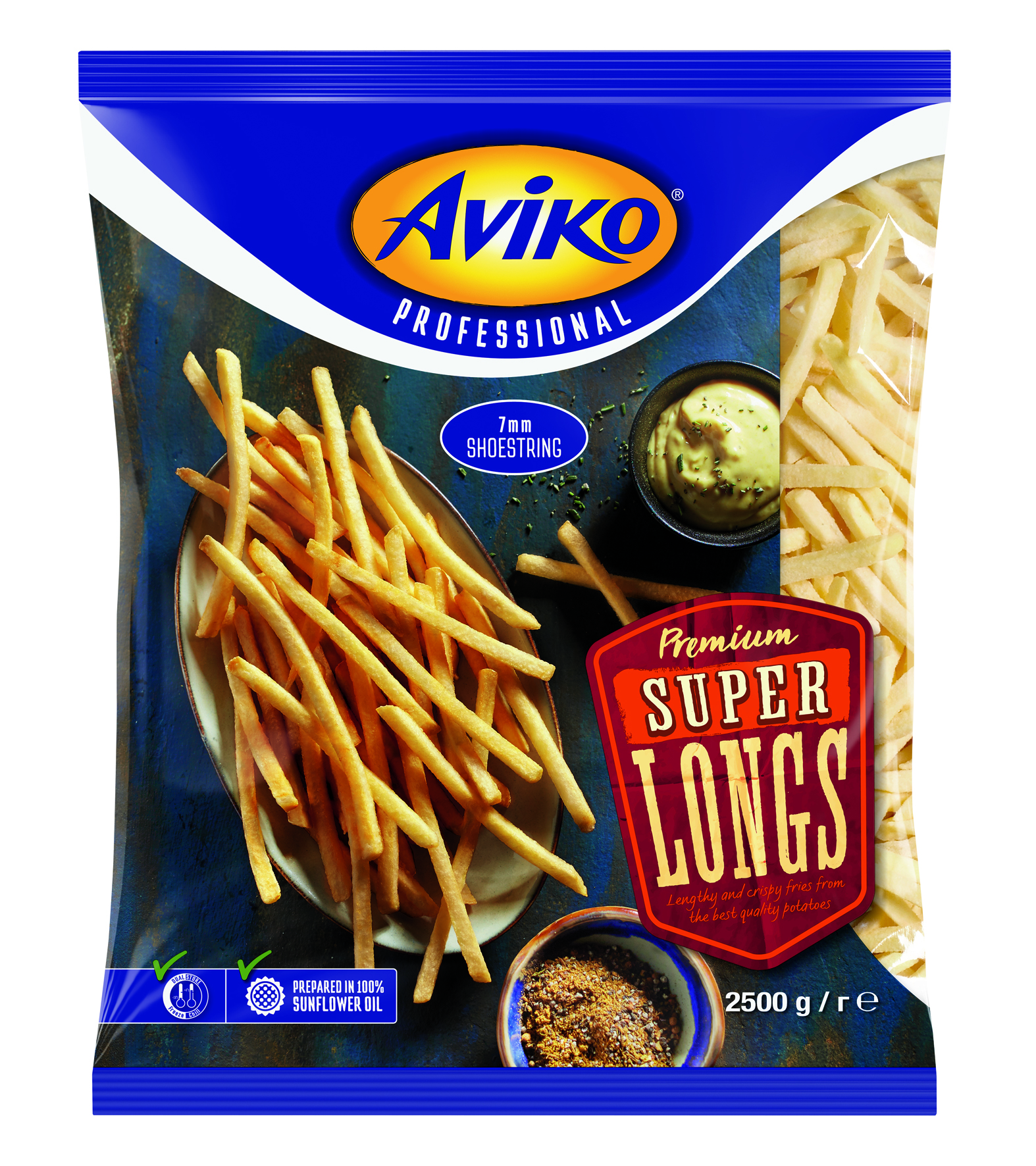 Patatine super lunghe, tagliate dritte e sottili 7 mm, prefritte e surgelate.