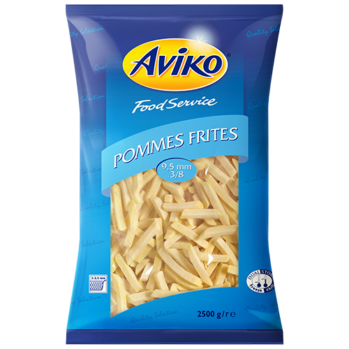 Patatine fritte taglio stick 9,5 mm, prefritte e surgelate.